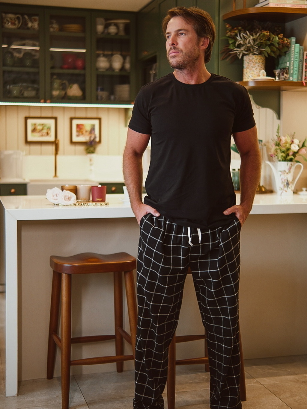 Camiseta em algodão egípcio 94% algodão e 6% elastano e calça em flanela leve, 100% algodão.